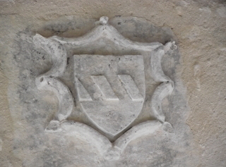 Au-dessus de la porte ogivale, un écusson armorié (souligné en bleu),
